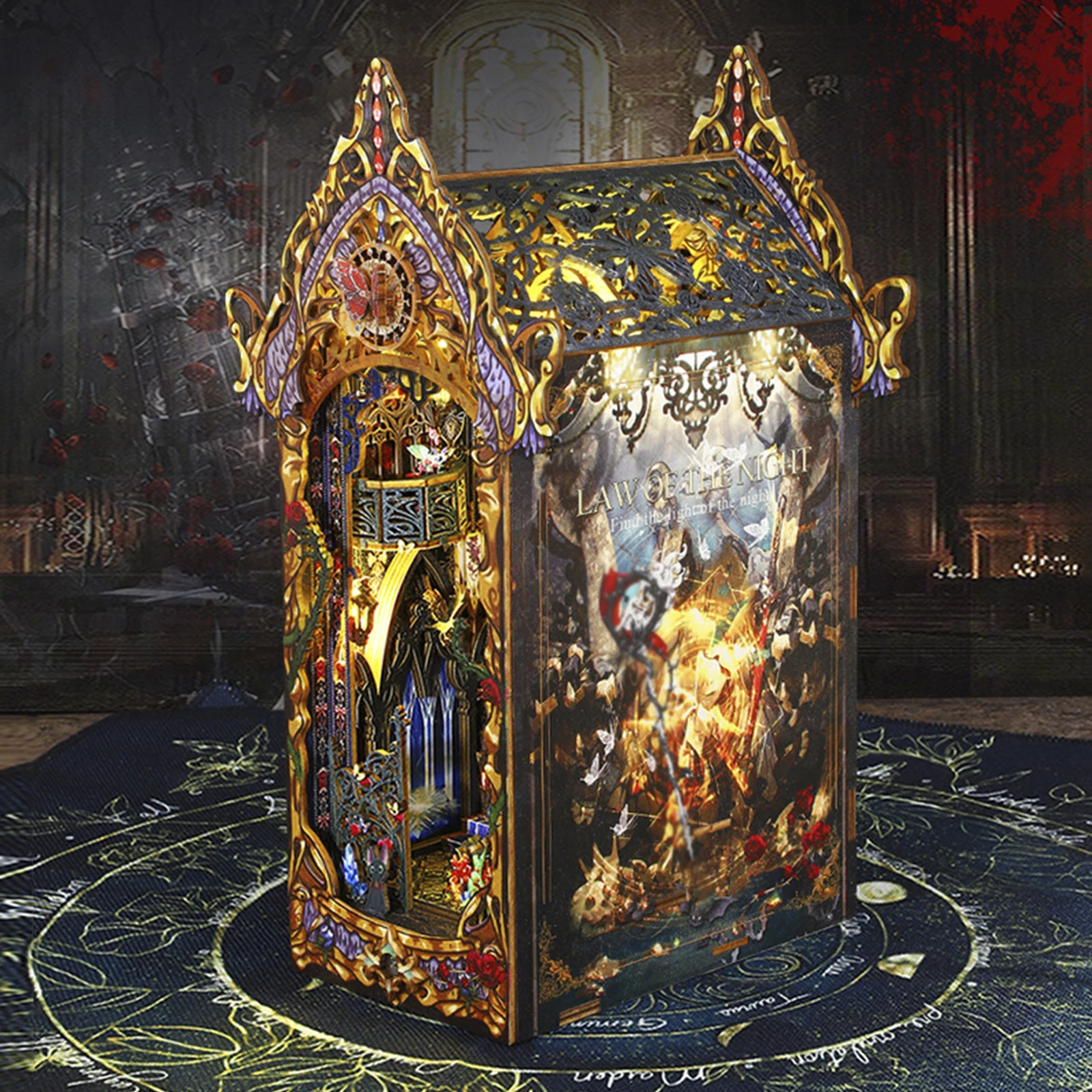 Law Of The Night - Miniature Dollhouse 3D Wood Puzzle DIY Book Nook Bookshelf Insert for Home Bedroom Bookend Decor Book House with LED Night Light